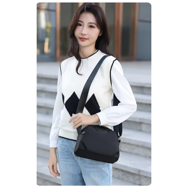 Portable Nylon Cloth with Cowhide Shoulder Bag (Black)